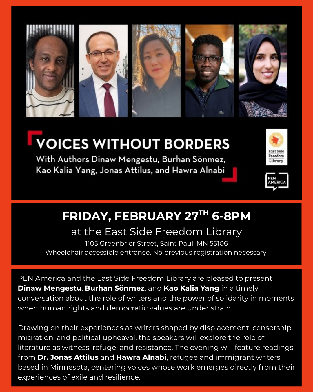 PANEL: VOICES WITHOUT BORDERS with writers Kao Kalia Yang, Dinaw Mengestu and Burhan Sönmez Feb 27 PANEL: VOICES WITHOUT BORDERS with writers Kao Kalia Yang, Dinaw Mengestu and Burhan Sönmez 6:00 pm - 8:00 pm