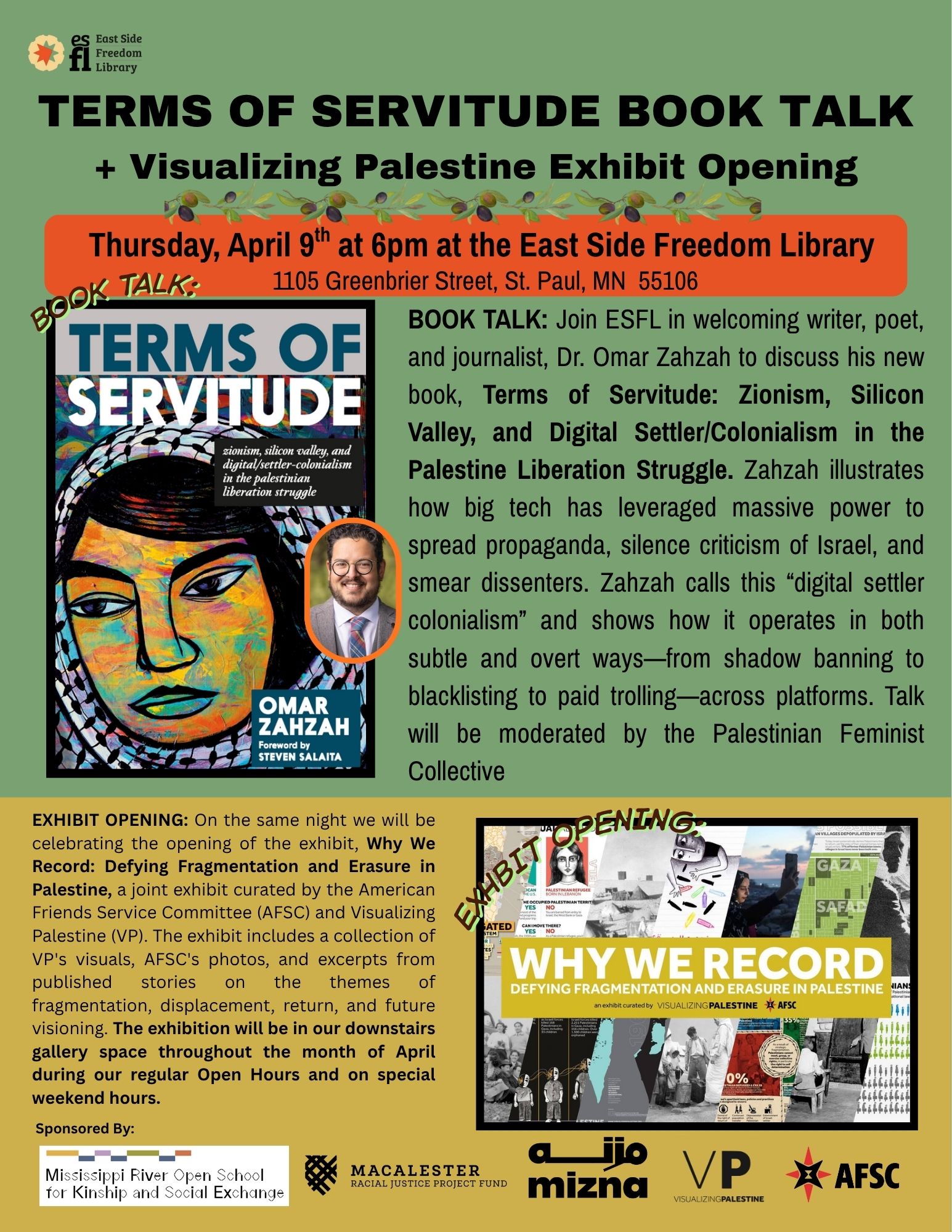 TERMS OF SERVITUDE BOOK TALK with author Omar Zahzah + Visualizing Palestine Exhibit Opening Apr 9 TERMS OF SERVITUDE BOOK TALK with author Omar Zahzah + Visualizing Palestine Exhibit Opening 6:00 pm - 8:30 pm